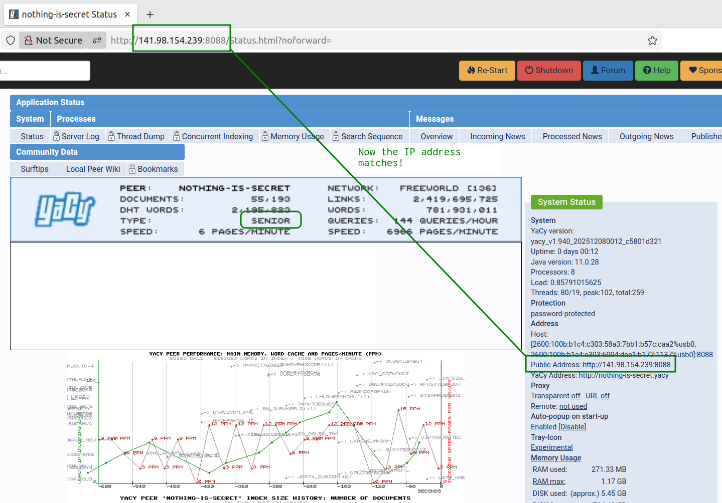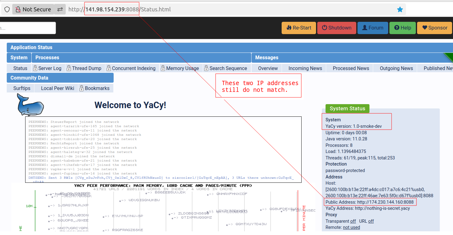 So your fork successfully put the working dedicated IP address from my SSH tunnel in the configuration file, but Yacy still does not seem to respect that in the System Status, using instead my cell phone’s public gateway, which cannot receive inbound connections, so it calls my peer Junior.